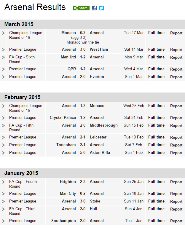 Hasil Pertandingan Arsenal di Tahun 2015